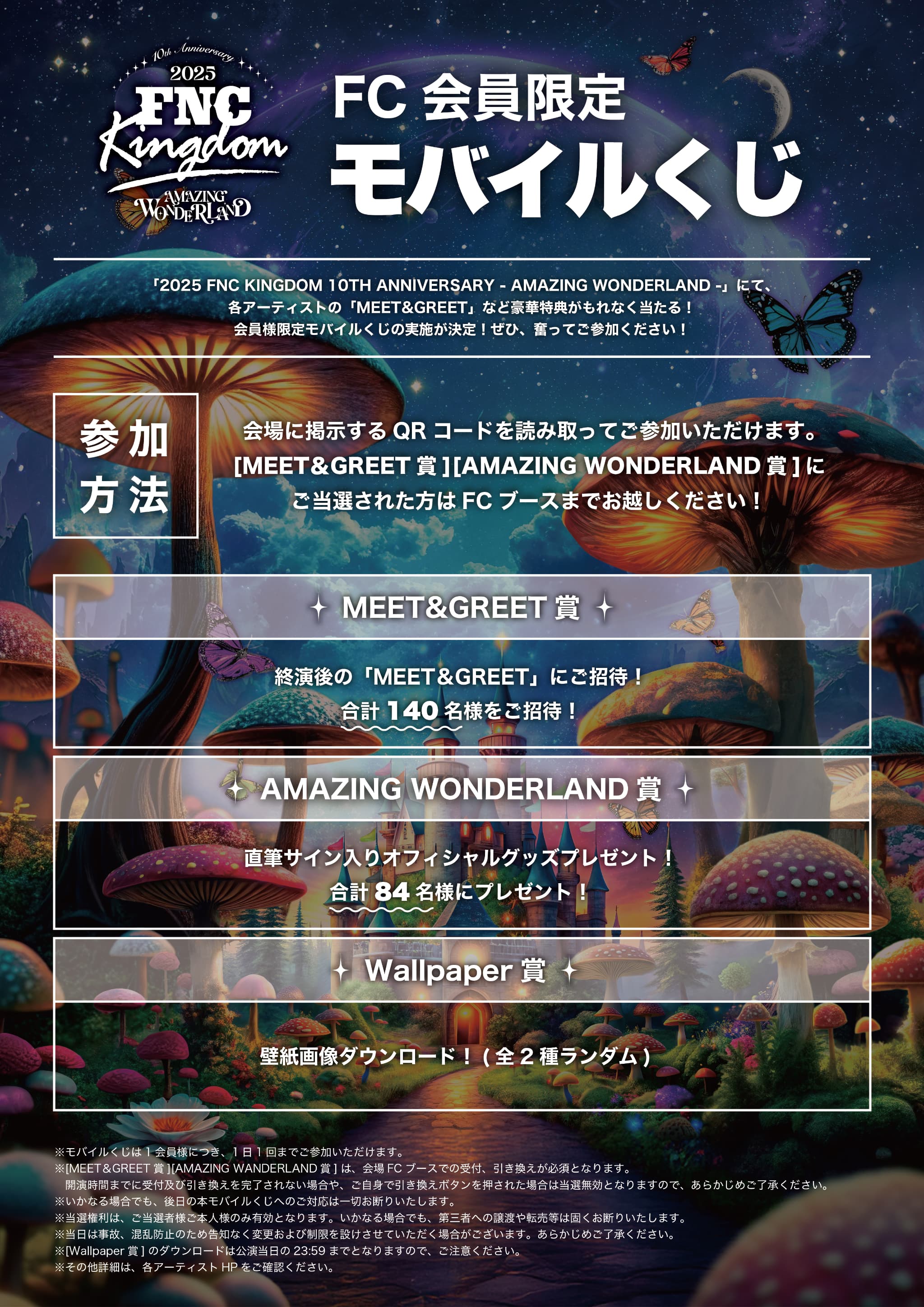 「2025 FNC KINGDOM 10TH ANNIVERSARY - AMAZING WONDERLAND -」会場での、FC会員限定モバイルくじ&ファンレター受付の実施が決定!